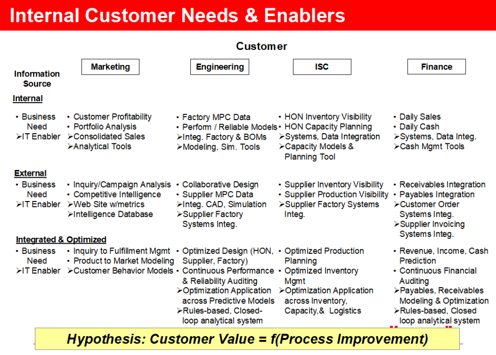 In terms of creating Customer Value it is imperative that a Supplier understand Customer Needs. Once these needs are known a variety of techniques can be utilized to understand the key processes involved. With a process understanding key inputs and transformations can be examined to drive improvement and ultimately competitive position. Figure B.4.1 represents a potential set of Process Improvement needs for a set of internal Customers. Note that for internal Customers these process improvements are generally internally focused, and that the business must be capable of translating these internal improvements to end Customer value.