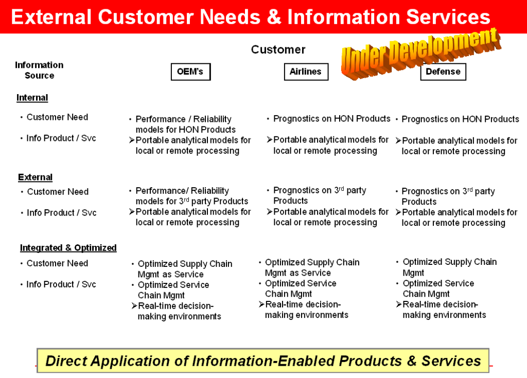 Externally, the leveraged use of information can create a truly new class of information-enabled or even information–based products or services. These new solutions would directly offer value to customers – helping them solve operational or business problems in fundamentally new ways. Such value is typically measured directly in terms of Product Revenue and Margin and fortunately readily available feedback ensures shortened decision-making time as to whether Customers value such an offering.