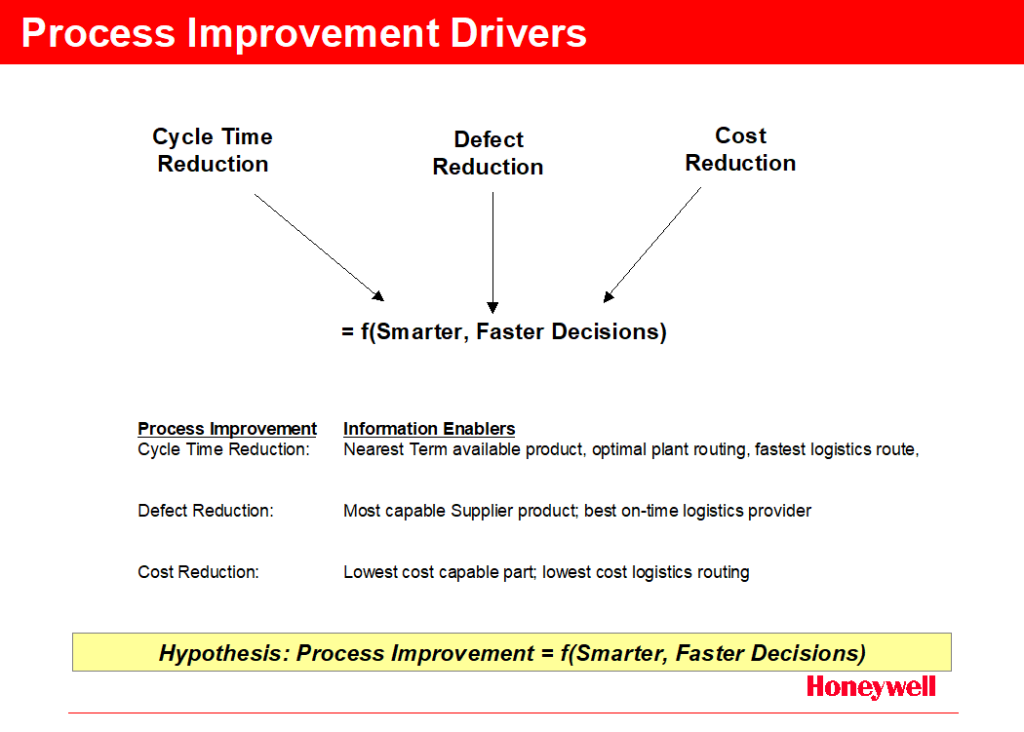 Taking the next step it is necessary to understand opportunities for process improvement and potential drivers. Again we are focused on the speed and quality of decision-making and how it drives cycle time, defect, and cost reductions. Figure B.5 offers a sampling of opportunistic approaches to improving key business processes. Each is dependent on availability of information or knowledge that has a direct impact on decision-making quality.