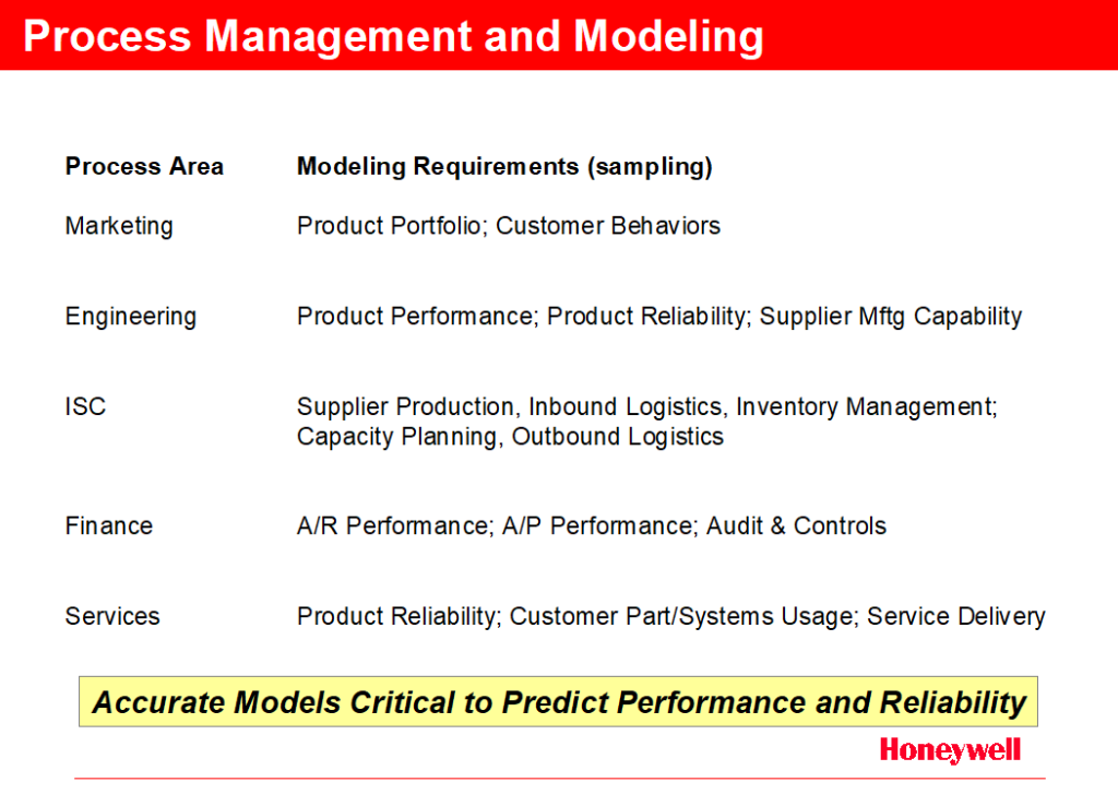 To determine what variables are value-added a variety of techniques are available, not the least of which is Six Sigma. Six Sigma provides for the structured decomposition of objectives and the understanding of input variables and integrating transfer function. In addition to classic Six Sigma there are a number of modeling tools like neural networks that can discover higher order effects between several variables. Such advanced tools can rapidly assist the modeler in understanding and even predicting behavior. Figure C.3 lists several obvious modeling inputs required to drive both Sensing and Analytical processing (see below). In short any model addressing Customer, Suppliers, Product, or Process capabilities is a likely candidate to enrich the overall “Smart Operations” environment.
