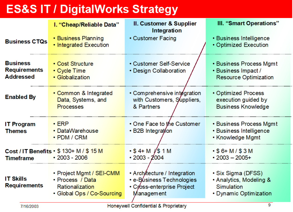 As noted above Phase I is a foundational step. While there will not be a strict I, II, III on a total ES&S basis, sufficient progress must be made on systems rationalization must be made before integration efforts can be deployed. Certainly early research and design work will begin immediately. Similarly, “Smart Operations” requires consolidation and standardization of data. Again, early research and design can and will be done to reduce overall cycle time, particularly as the Aerospace ERP program will be focusing on major parts of the Enterprise Data Model.