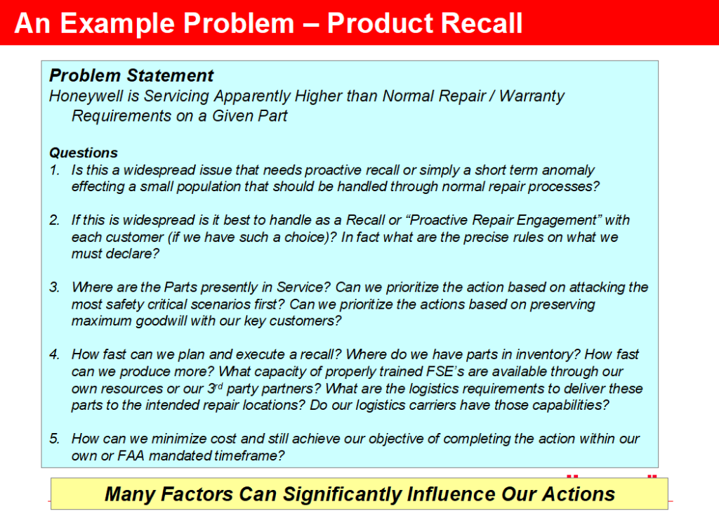 One common challenge facing any complex product producer is the possibility of having to issue a product recall to fix a latent defect in design or manufacturing. In the Aerospace industry this problem is especially critical for two primary reasons: (1) defective products can jeopardize the safety of passengers; (2) taking a very expensive asset (airplane) out of service for even a short period of time can be economically devastating to a Customer.