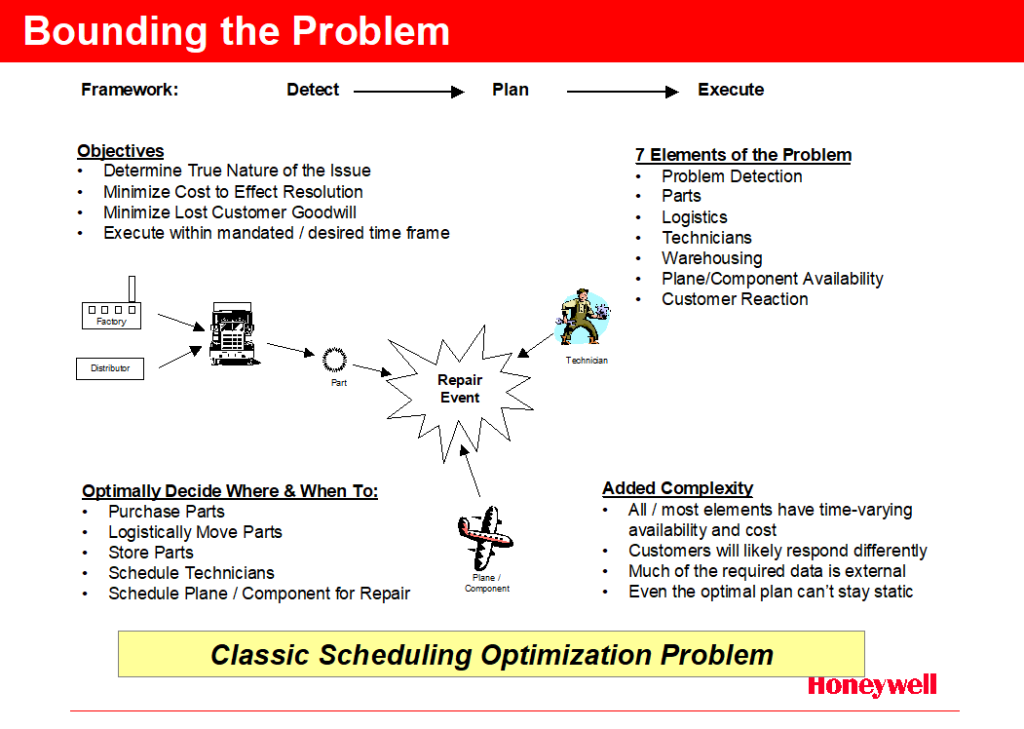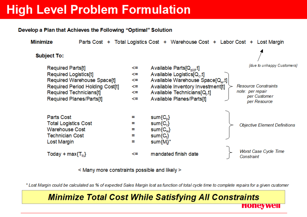 As the recall problem is explored it becomes apparent that it directly parallels a classic scheduling optimization problem. Within that framework we can formulate a problem description as in Figure F.1.4. In that formulation we wish to minimize cost (note the lost margin due to Customer dissatisfaction with total cycle time) while subject to any number of constraints – in particular part, technician, logistics, and Customer plane availability.