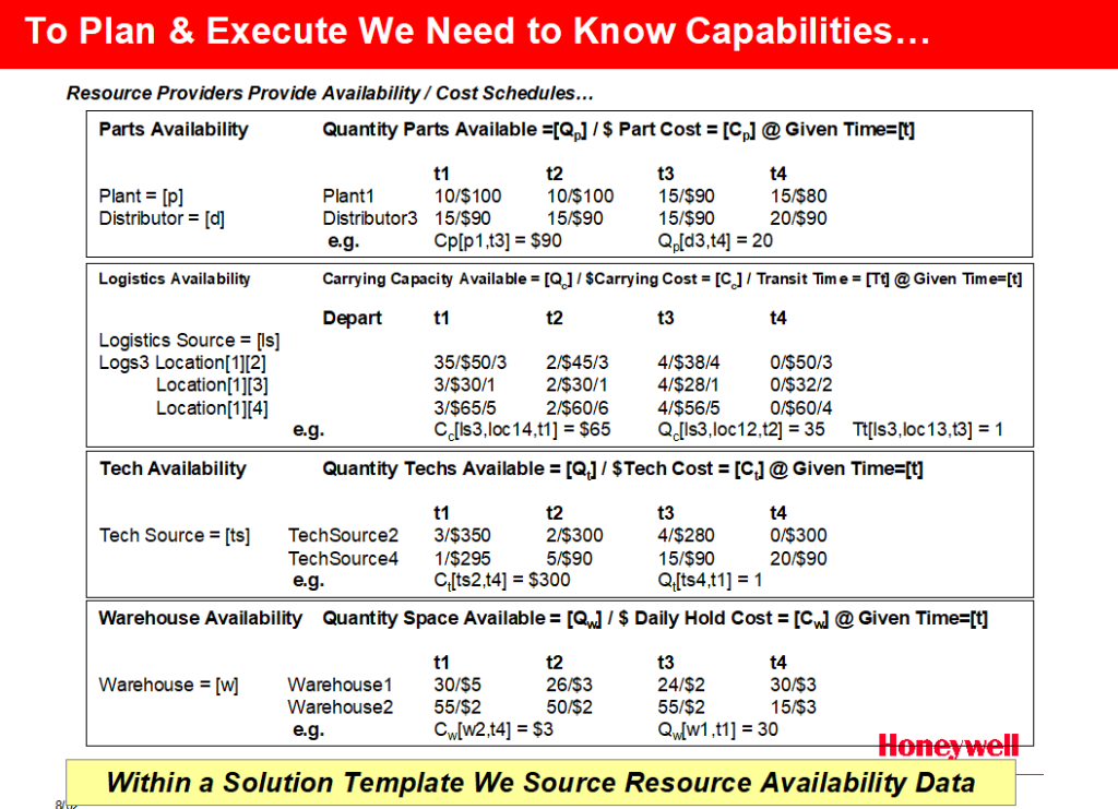 To proceed with problem solution it is necessary to collect available data on the constraints in the formulation. This entails interacting with both internal and external systems to directly pull availability data according to a scripted set of information needed. Here the B2B integration capability provides rapid, low-cost information from suppliers systems that can be directly fed to the optimizer. Note that this same mechanism will be used to collect ongoing performance signals that allow the business process manager (or BPM tool) to track progress and if necessary re-start the optimization cycle.