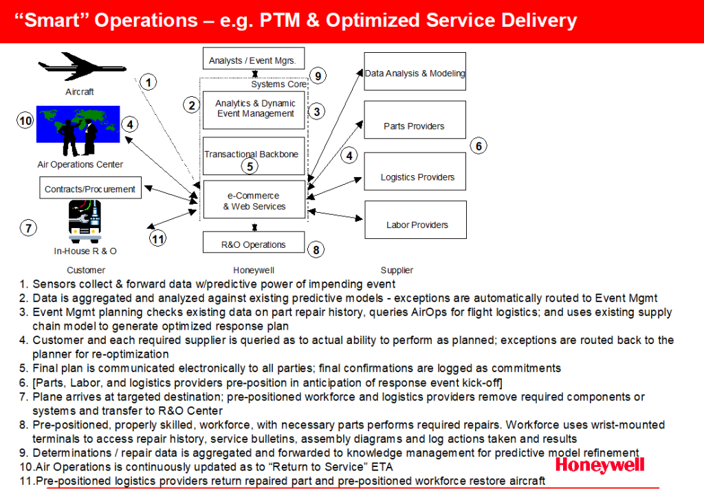A number of examples will be presented to explore the power of the “Smart Operations” concept. The OEM Product Recall example represents a typical complex, long running business problem with many dimensions and competing priorities. The Optimized Service Delivery example demonstrates the power of connecting the product-based predictive tools under development today to the back-end execution capability. Finally a straightforward extension of the architecture is explored as to its applicability to the hierarchical challenges of managing a future military battlefield.