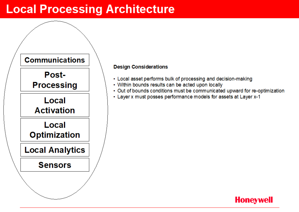 Also, the Honeywell HTSL efforts around SHARP (Real-Time Operating System) could be an excellent platform for such distributed processing requirements. A Linux-based kernel would be standards-based, “lightweight,” highly open and configurable. A robust real-time kernel with specialty “Smart” software modules for specific processing responsibilities (see the processing architecture below) could be easily built on a per component or system basis. This would further optimize the processing requirements on the given platform.
