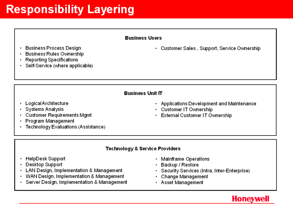 Another useful construct is the layering of responsibilities between the Business, Business Unit IT, and the Technology & Services providers (e.g. ITG, Oracle, SAP).