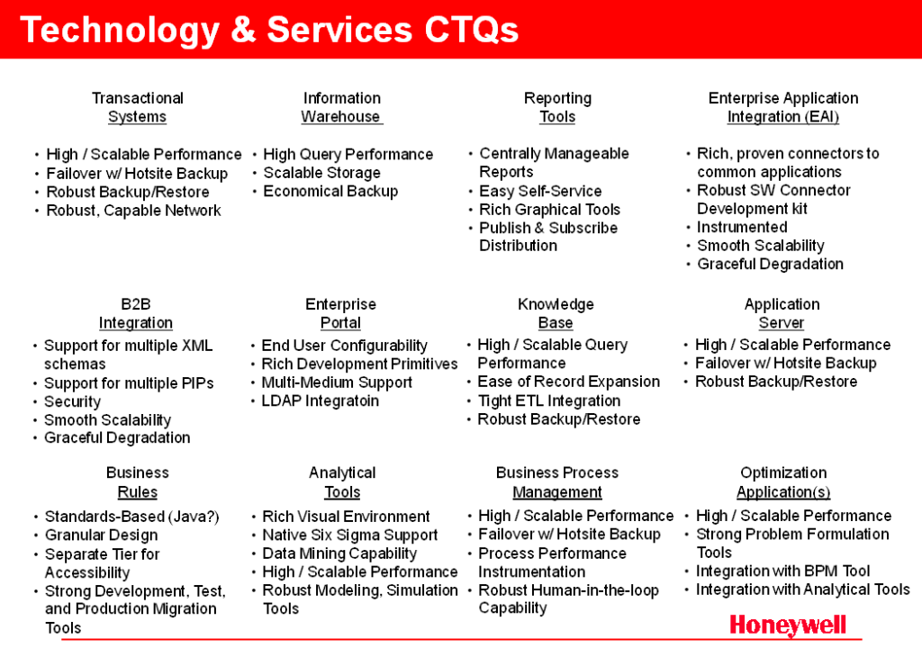 To power this (or any) advanced IT architecture it is imperative to have a robust, underlying set of IT “services” and systems. This foundation is key to speeding the deployment of the key functionalities needed for “Smart Operations”. Figure G.3 outlines some of the key Critical to Qualities (CTQs) for the various architectural elements.